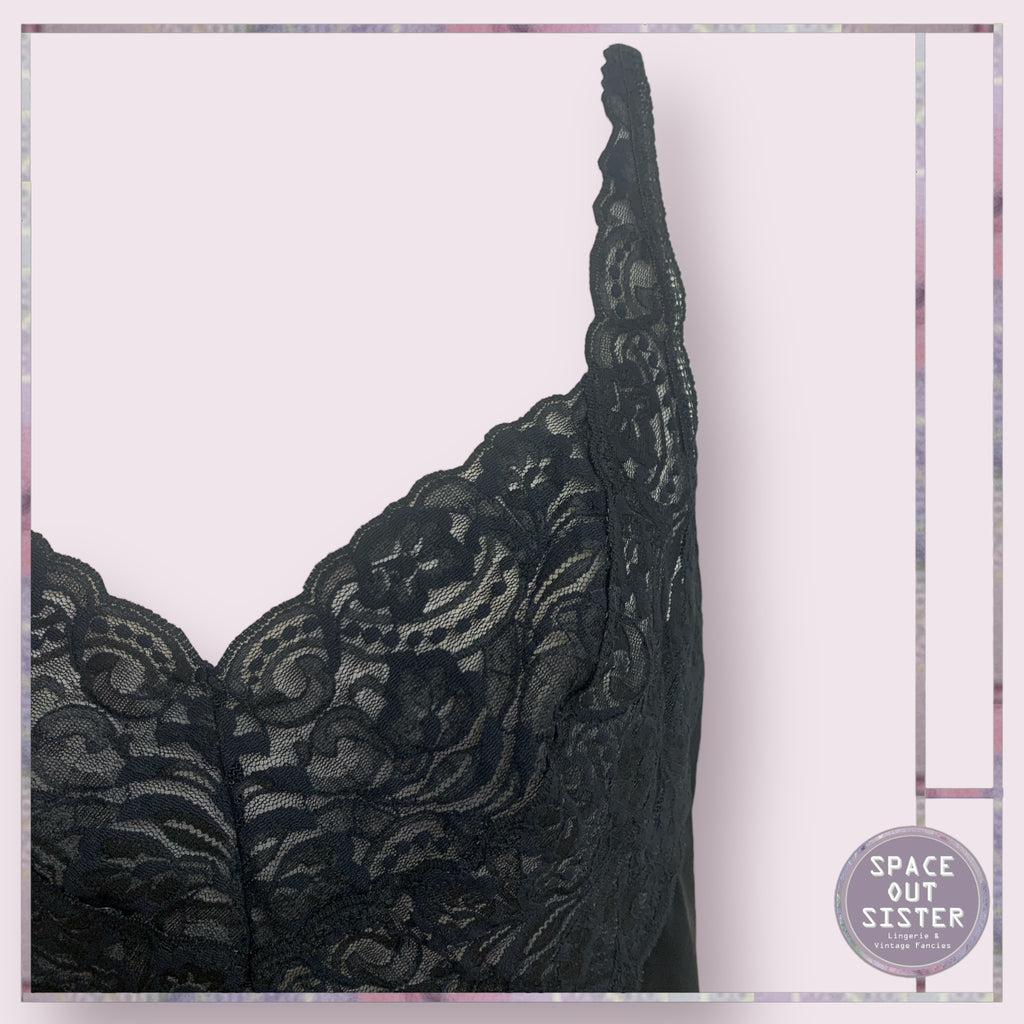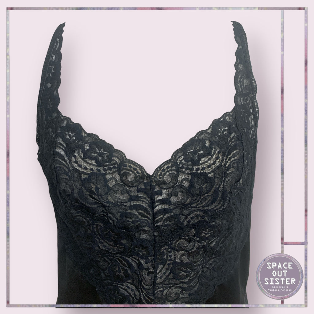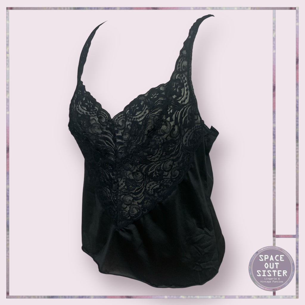 This vintage black camisole by Vanity Fair features a deep V lace bodice for a touch of elegance. With its classic design and high-quality fabric, this camisole is sure to add a sophisticated touch to any outfit. Elevate your wardrobe with this timeless piece.