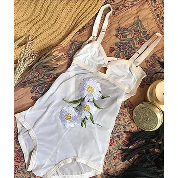 Limited Edition Handmade Mesh Embroidered Bodysuit by Solstice Intimates. Soft mesh with embroidered flower detail with adjustable straps.  This piece is exclusively available at Space Out Sister.  If you would like more information on sizing, please just ask.