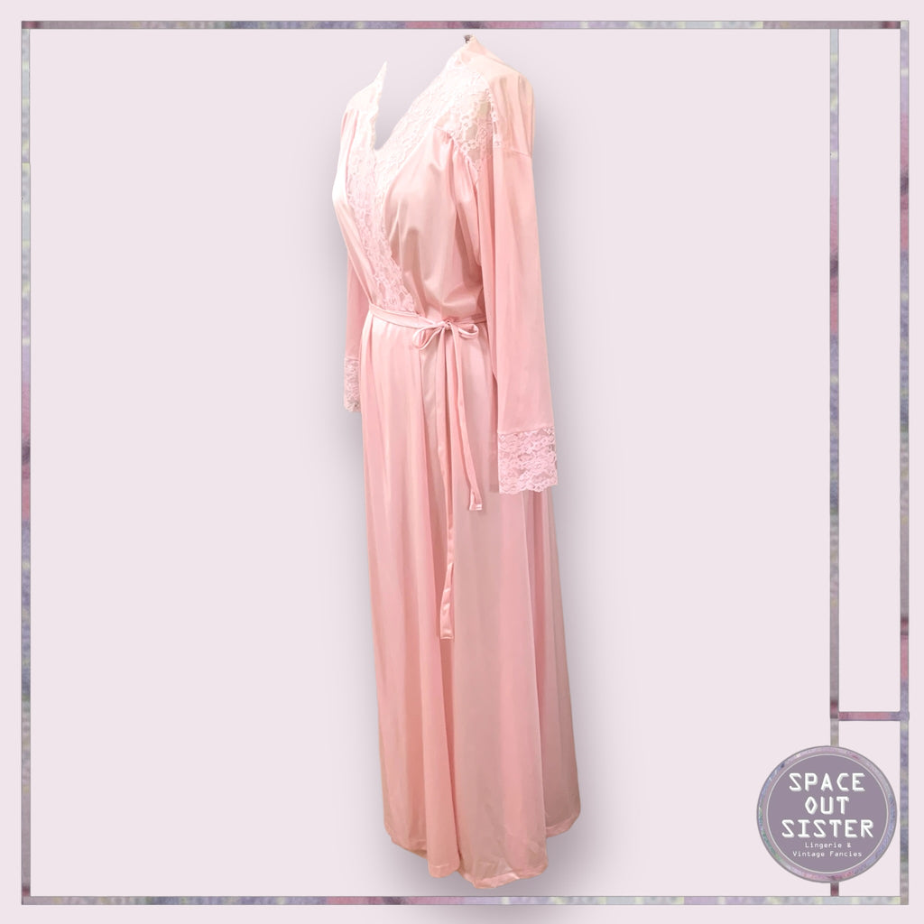 Embrace the essence of timeless elegance with the Vintage Kayser Robe, a captivating piece in soft pink adorned with exquisite lace cuffs and lapels. This ornate garment transcends mere fashion, offering a cocoon of luxury that envelops you in sophistication, perfect for moments of tranquil repose.