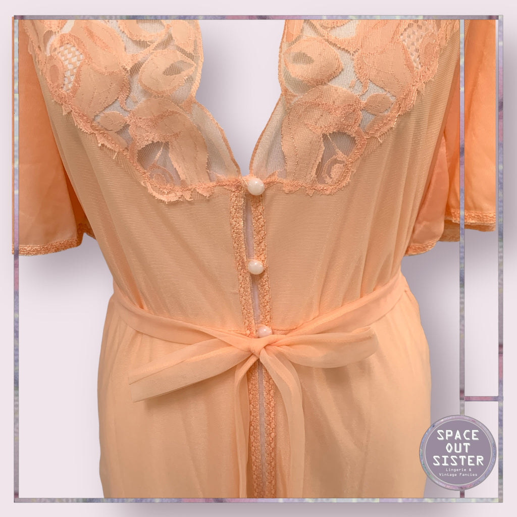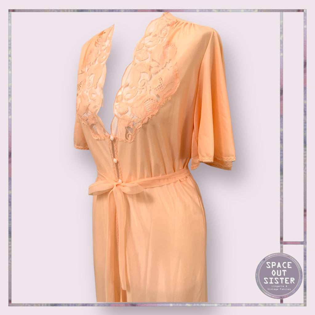Indulge in the timeless elegance of the Vintage Tangerine Peach Robe, a full-length silhouette adorned with delicate lace lapels that whisper sophistication. The harmonious interplay of warm hues and refined details transforms this piece into a luxurious embrace, perfect for those tranquil moments of leisure that deserve an aesthetic touch.