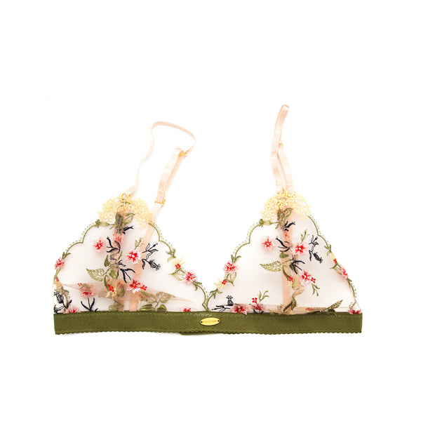 Our Finley triangle bralette is your everyday go-to cutie. Made with dainty olive floral embroidery with soft pink and baby yellow details in an easy-to-wear, cute-to-show-off style, with adjustable shoulder straps for a personalised fit and fastens at the back with a hook-and-eye closure.