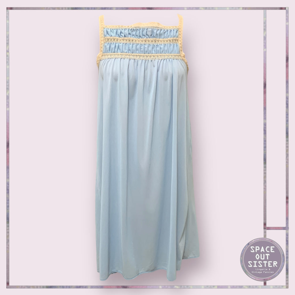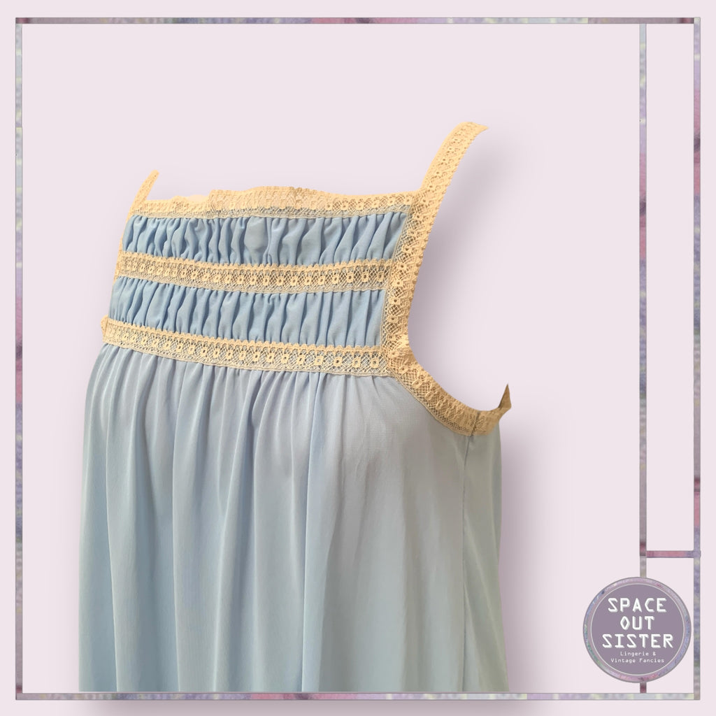 Embodying the essence of timeless elegance, the Vintage Mary Sears Nightdress juxtaposes a delicate blue hue with subtle champagne accents, inviting you to revel in a realm of refined comfort. The thoughtfully smocked bust area not only enhances the silhouette but also whispers of an artistry that transcends mere fabric, making this piece an exquisite addition to your nocturnal wardrobe.