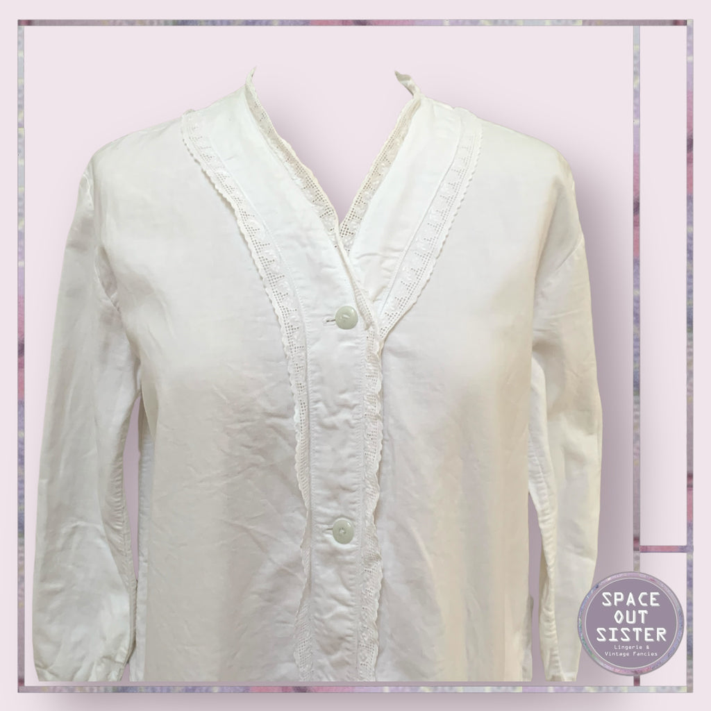 This antique cotton nightdress features a button V neckline, providing both comfort and elegance. Made with high-quality cotton, brushed cotton inside, it creates a soft and breathable feel, perfect for a good night's rest. A timeless addition to any nightwear collection. As seen, some wear evident on the cuffs & a repair to an area at the underarm & a blemish to the front.