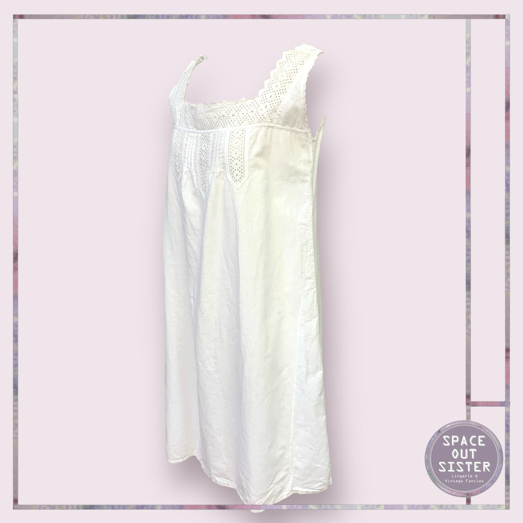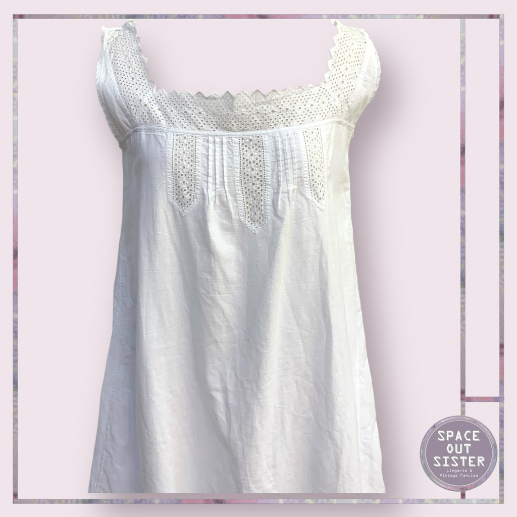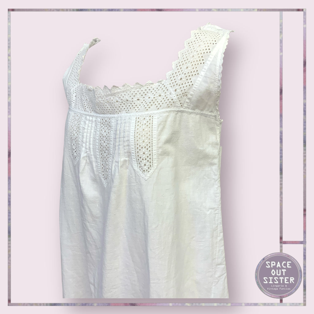 Expertly crafted with antique cotton, this stunning white chemise boasts an ornate neckline and elegant shoulder buttons. Its timeless design and delicate detailing make it the perfect addition to any collection.