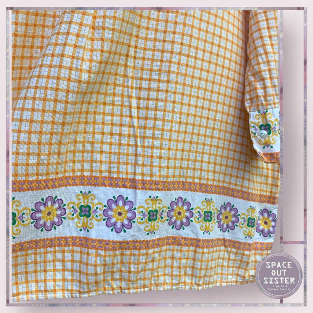 Unleash your inner vintage queen with our Vintage Grid Orange Nightdress! Made from soft cotton, this knee-length nightdress features full length sleeves with ornate floral cuffs for a touch of elegance. The vibrant orange plaid design adds a pop of color to your nightwear collection. A stunning find that is sure to become a favourite!