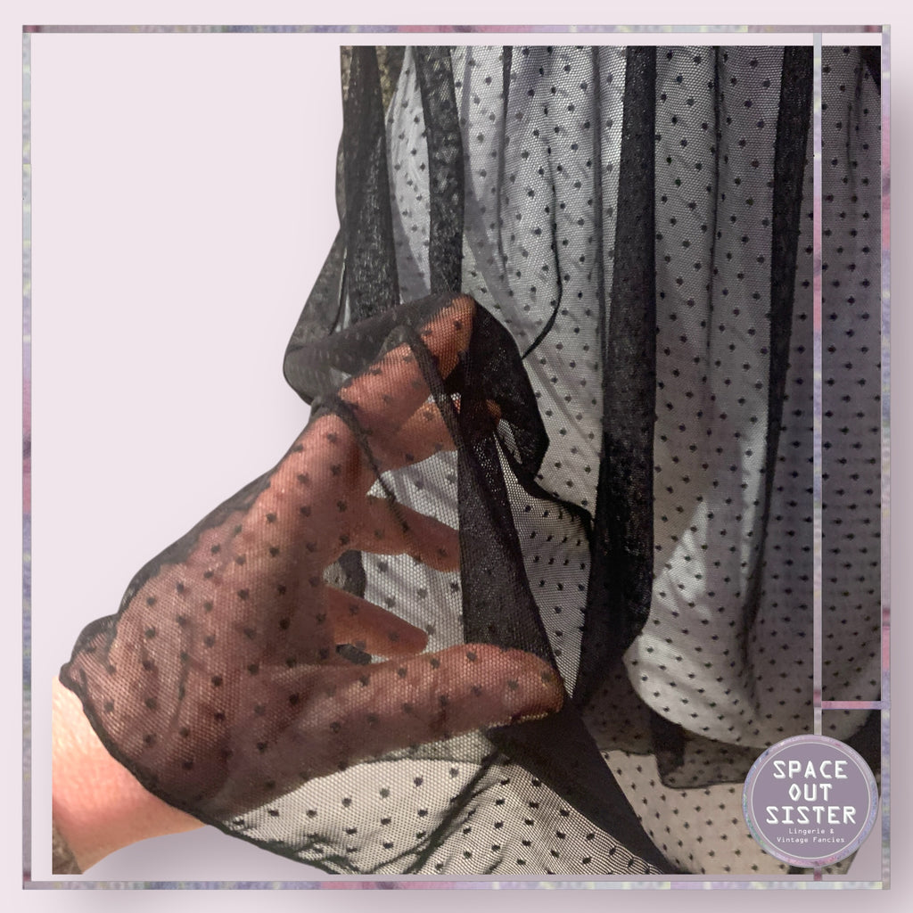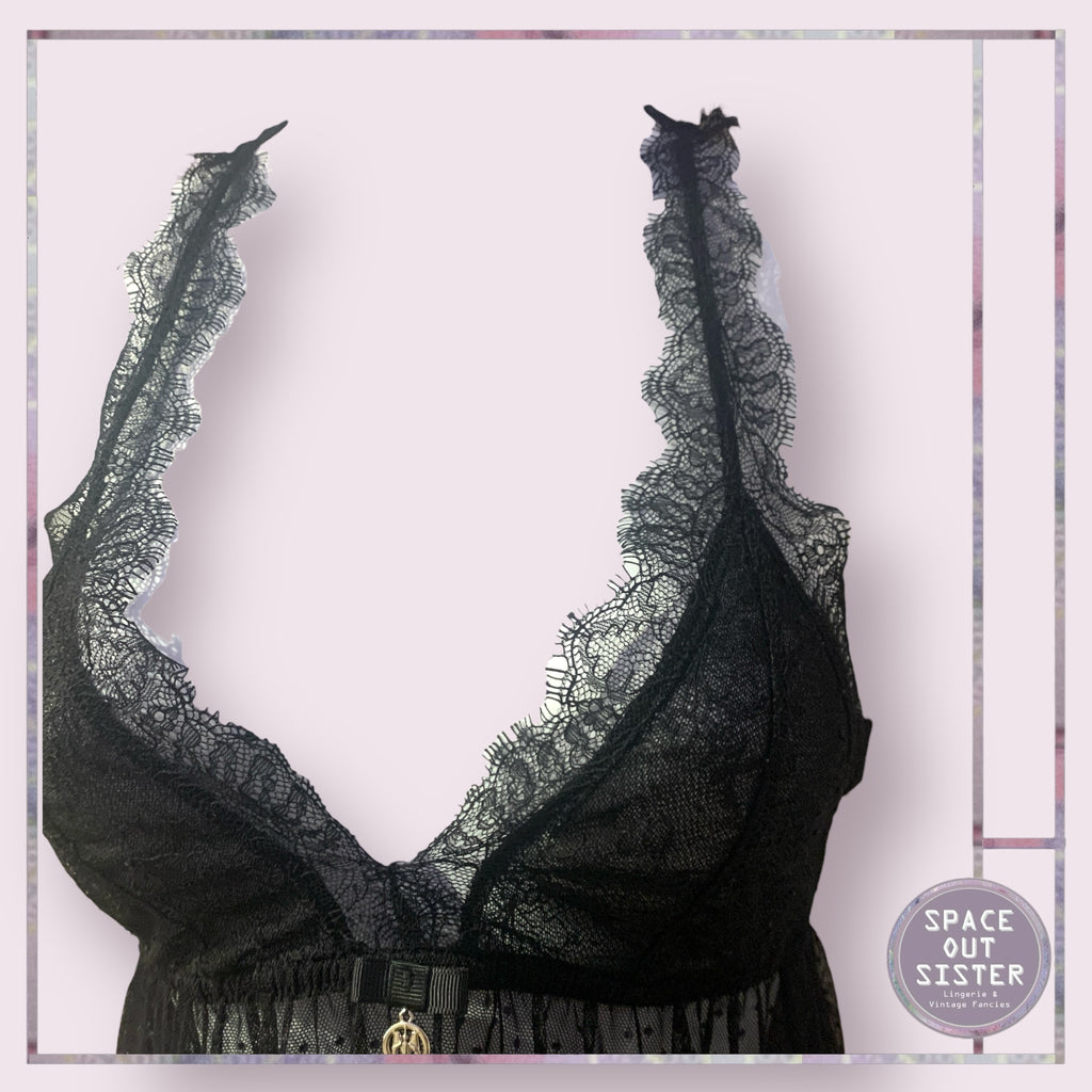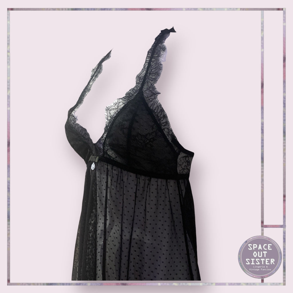 Slip into the Vintage M Nightdress and prepare for a night of enchanting dreams (or late-night snack raids). This sheer black beauty, adorned with delicate eyelash trim lace, is so pretty it might just steal the spotlight from your bedtime stories! Perfect for those “I woke up like this” moments—because who says you can’t sleep in style?!