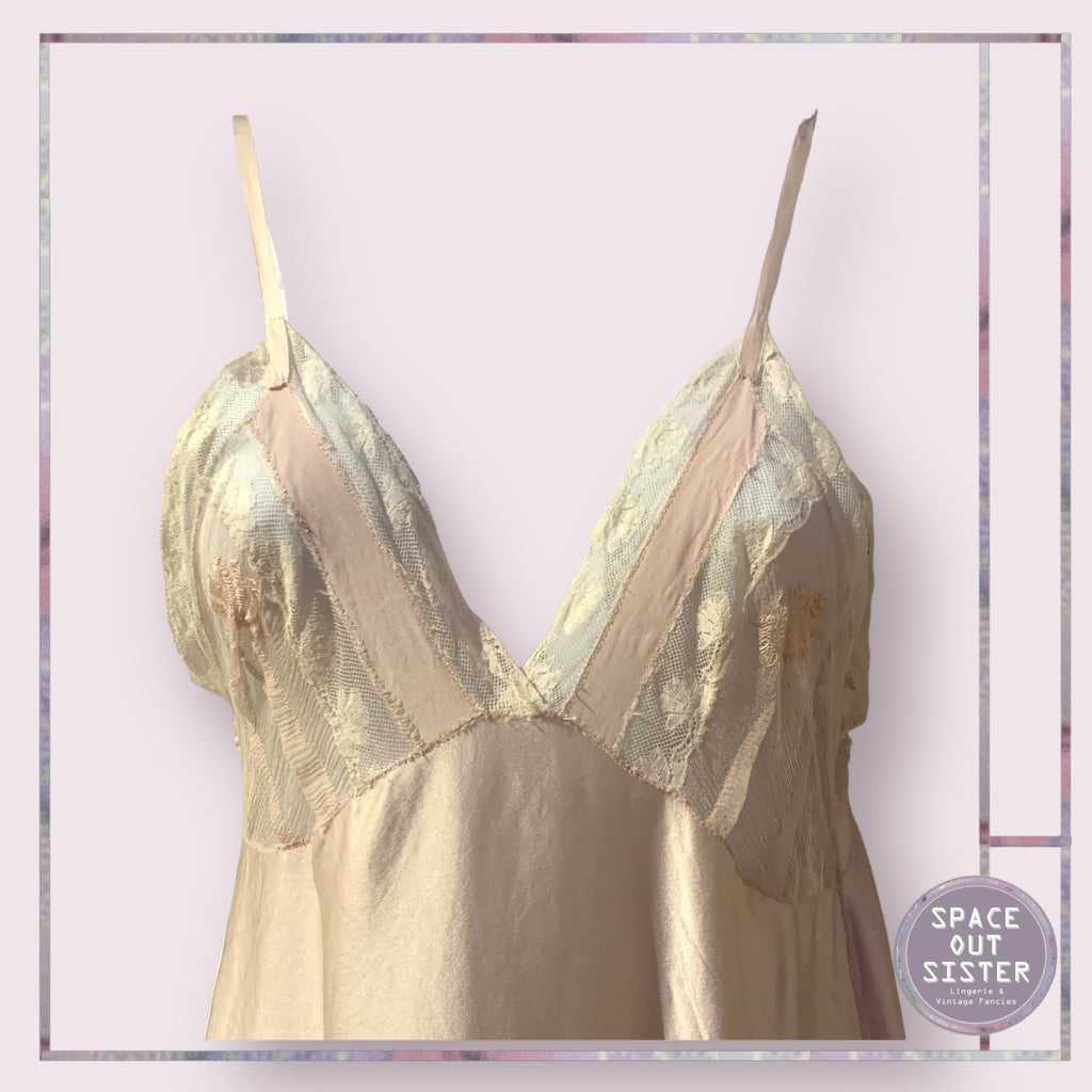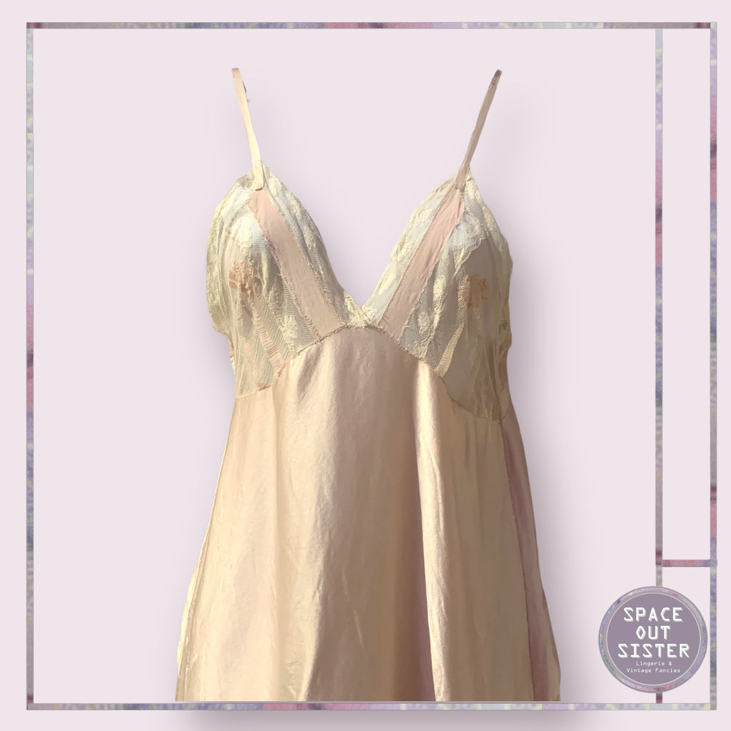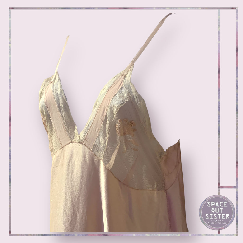 Indulge in timeless elegance with our Vintage Silk Tea Rose Slip Dress. Crafted from delicate silk with intricate ribbon straps and a luxurious silk crepe bust, this dress exudes pure sophistication. Perfect for any special occasion, this dress is simply divine.